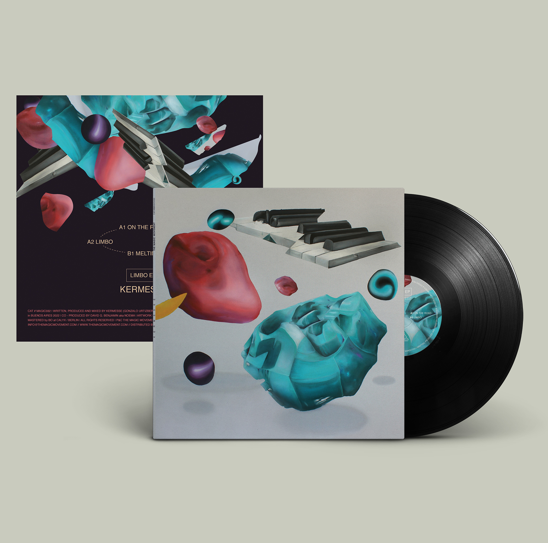 El proceso creativo fue muy interesante, usamos como disparador la IA generativa de imágenes, y a partir de muchos resultados compusimos una nueva imagen original. Esta imagen fue traducida a un lenguaje pictórico en tela. Luego realizamos el diseño de packaging y póster que incluye el lanzamiento.